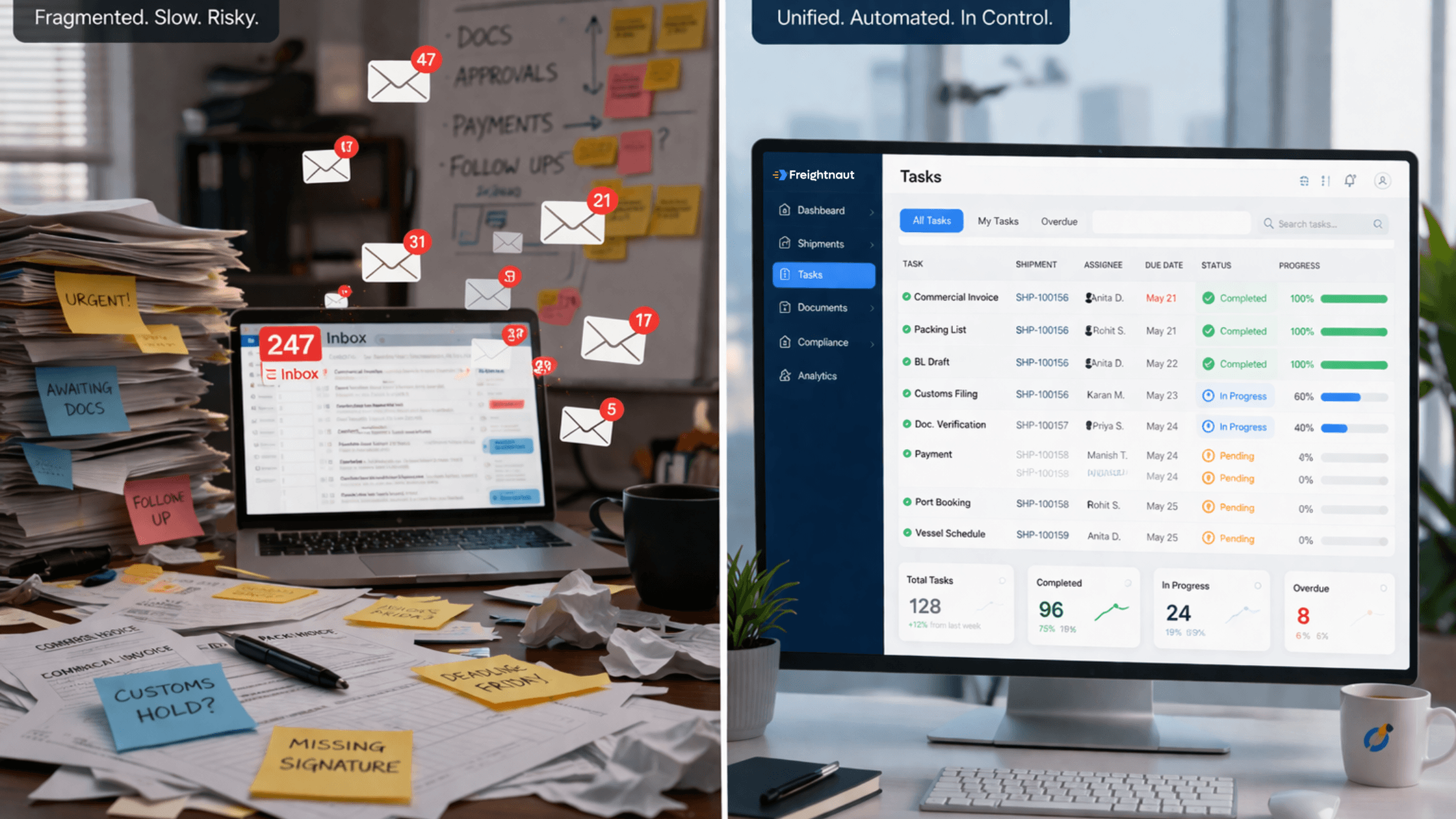 Manual shipment management creates invisible costs that accumulate across every export transaction. When your team relies on email chains, shared drives, and Excel spreadsheets to coordinate shipments, critical information gets buried, tasks fall through the cracks, and delays become inevitable.