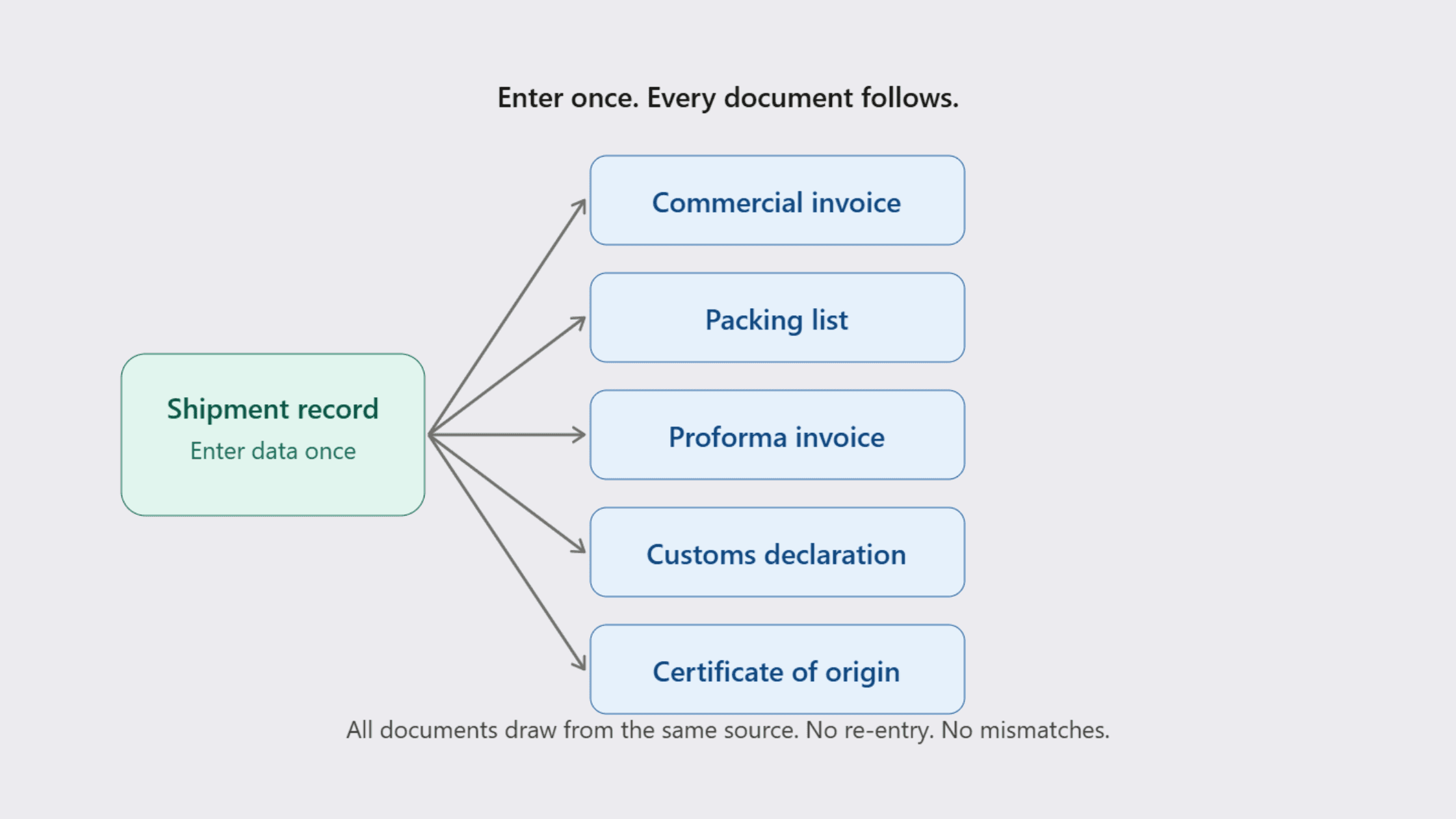 What is export documentation automation? Export documentation automation is the use of software to generate and populate shipment documents, such as commercial invoices, packing lists, and customs forms, from a single shared data source. Instead of entering the same information manually across multiple documents, the system pulls from one shipment record and fills each document automatically, reducing errors and preparation time.